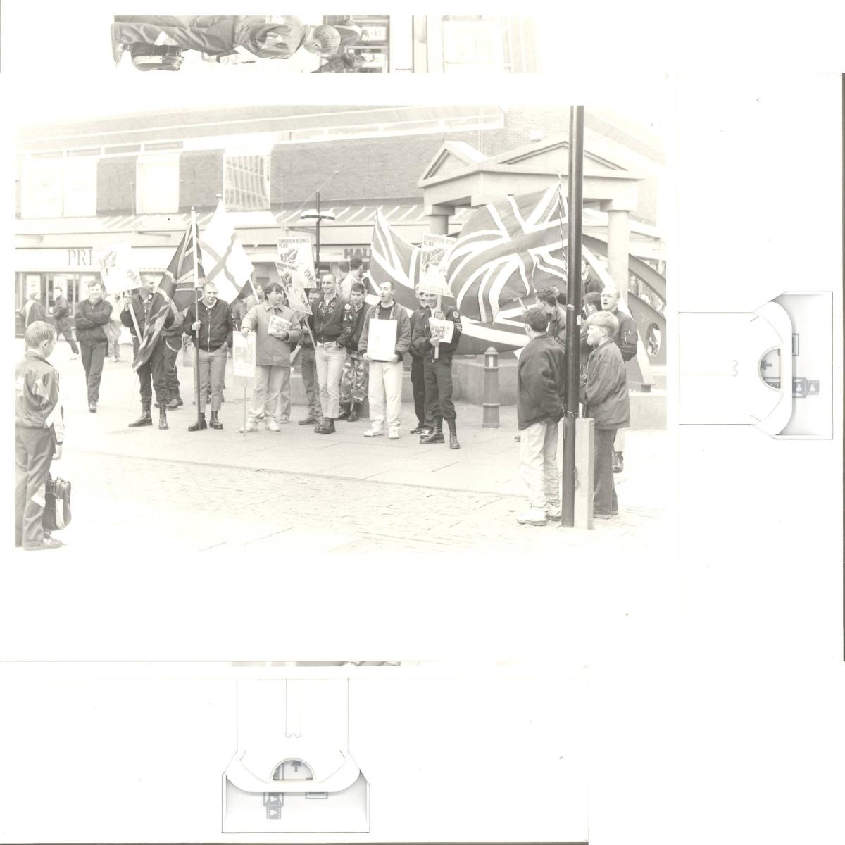 This photo was taken on 22nd February 1992 at the Bridges Shopping Centre, Sunderland. On the left with folded arms is then BNP regional organiser, Kevin Scott. Scott had been conducting regular paper sales at this location since the autumn of 1991, shortly after his graduation from Newcastle University with a First class degree. He was particularly happy that day because BNP numbers were augmented by B&H boneheads en route to a gig that evening in Newcastle. Scott attended the gig but did not have a good time. Others, apparently, had a smashing time.