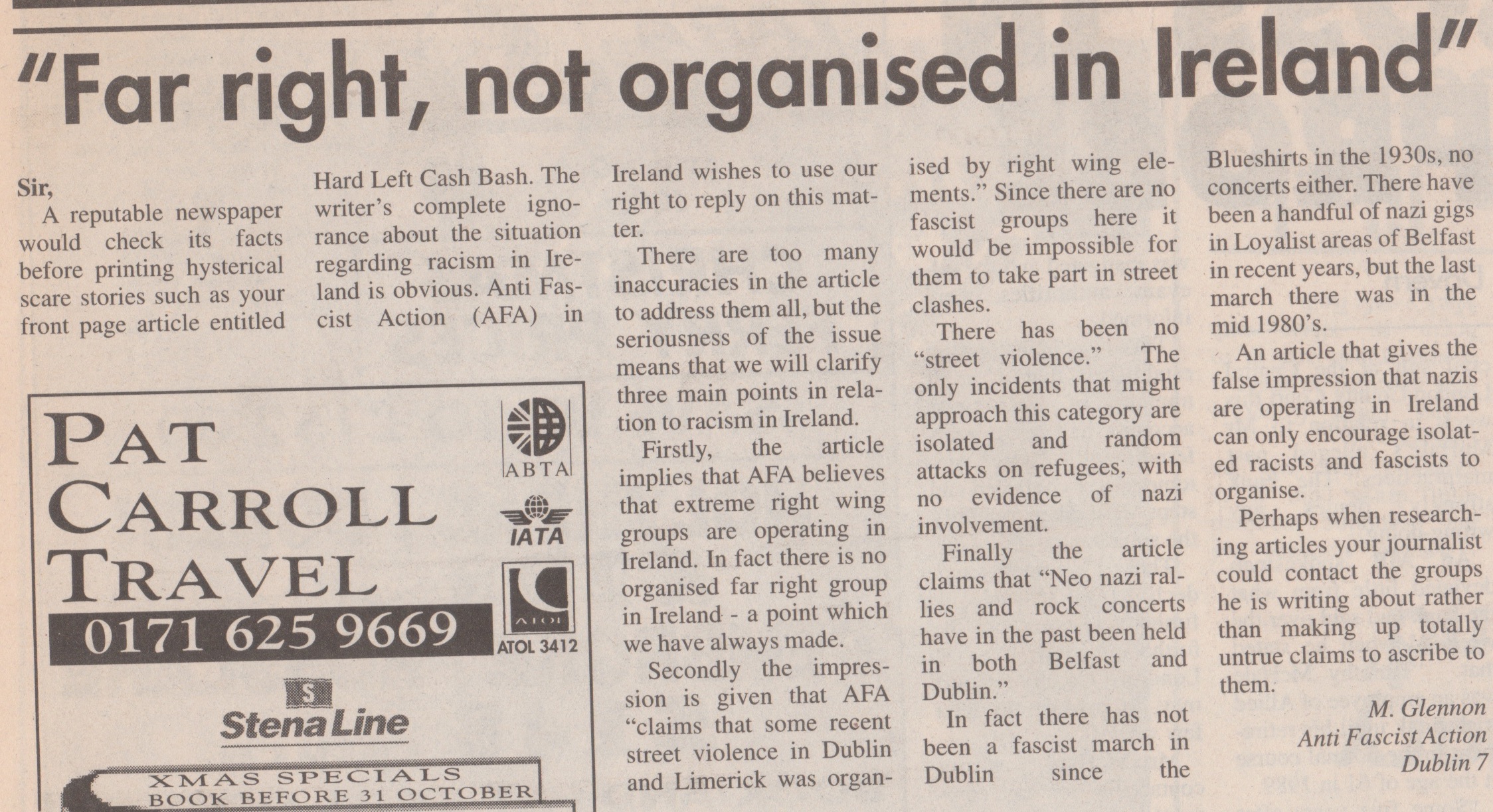 - “Far right, not organised in Ireland” (Letter from Dublin AFA to The Irish World, 10 Oct 1997)