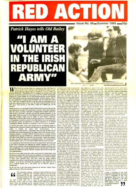 Of course no one in Red Action knew when, or precisely why, Patrick Hayes took the decision to join the IRA, but from his own testimony it is clear that he regards support for the military campaign and taking part in it more a matter of emphasis than some ‘quantum leap’. Pat never made the media inspired ‘graduation from being a weekend radical to becoming an IRA volunteer’. As in the case of Portinari [a Loyalist gunrunner] the explanation is quite simple. He never was a weekend radical. He is, and always was in whatever capacity a revolutionary.